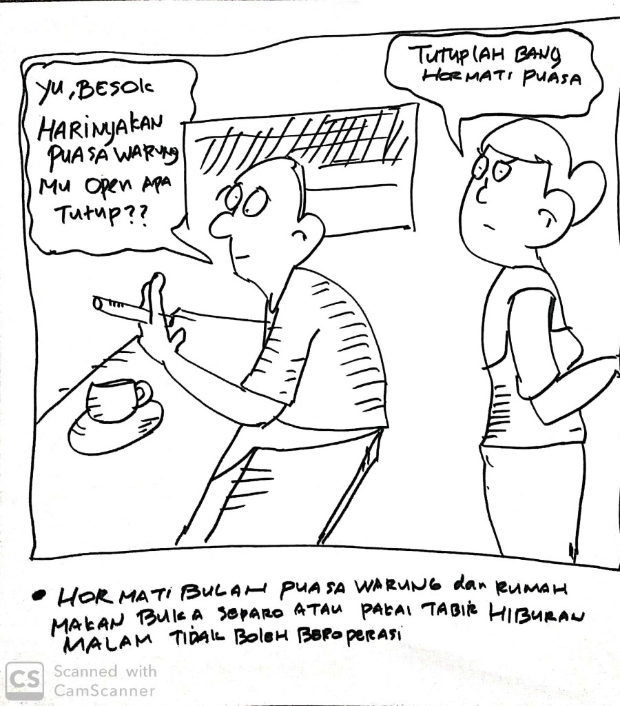 Kritik Kartun – Selama ibadah puasa Ramadhan 1441 H, Warung dan rumah makan harus menghormati bulan puasa (buka separo atau pakai tabir) dan tempat hiburan malam tidak boleh beroperasi.